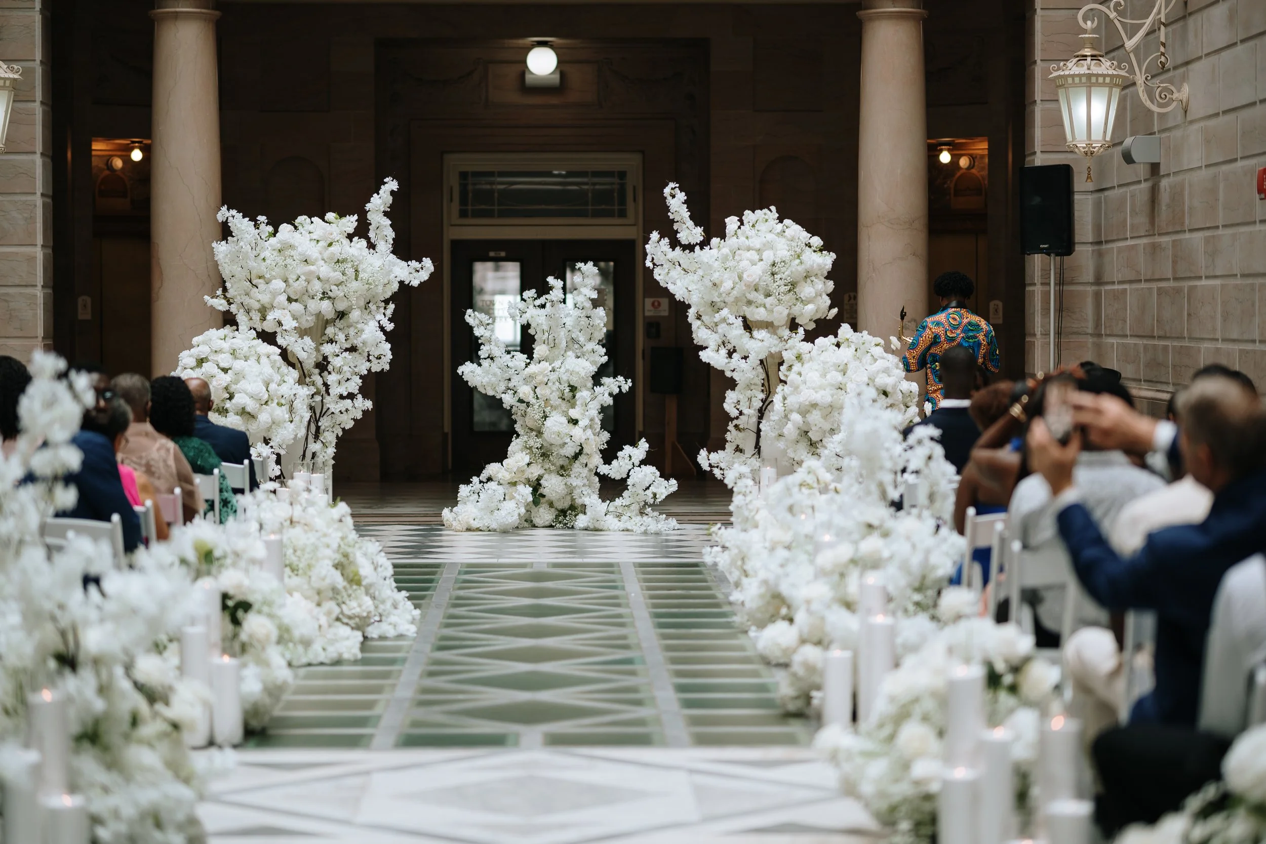 On the morning of the wedding, our team transformed the space piece by piece—installing the floral trees, placing candles, and adjusting each detail until the room felt balanced and complete. By the time guests arrived, the historic civic building had become something entirely different: a romantic ceremony setting that felt both elegant and personal.